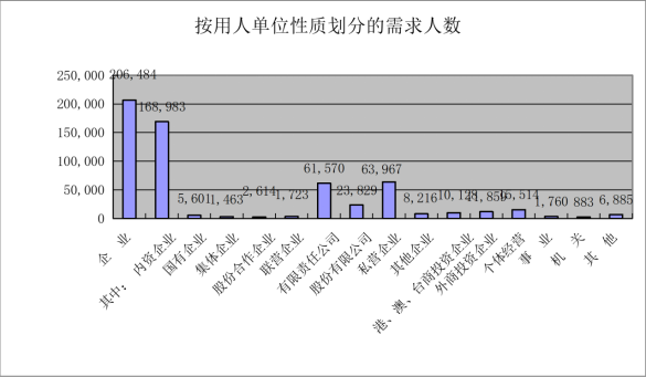 从用人单位性质来看:内资企业需求总量为16.90万人次,所占比重达到企业需求总量的81.84%;内资企业中的“私营公司”、“有限责任公司”、“股份有限公司”为用工需求量前三位的用人单位,用工需求量分别占企业需求总量的30.98%、29.82%、11.54%。