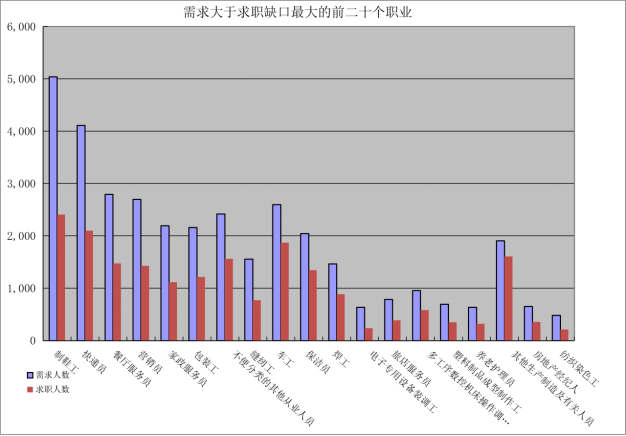 一是求大于供岗位(工种):“制鞋工”、“快递员”、“餐厅服务员”企业需求缺口分别是2630人次、2011人次、1319人次。二是供大于求岗位(工种):“商品营业员”、“行政办事员”、“秘书”的市场登记缺口分别是-2013人次、-1462人次、-819人次。